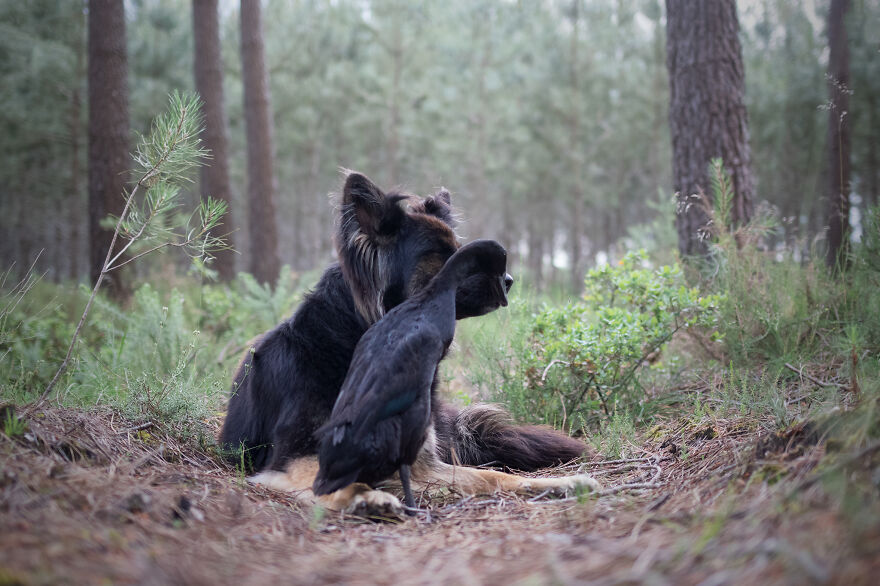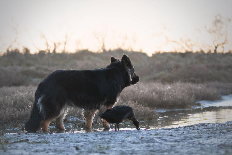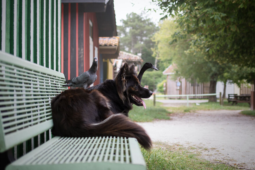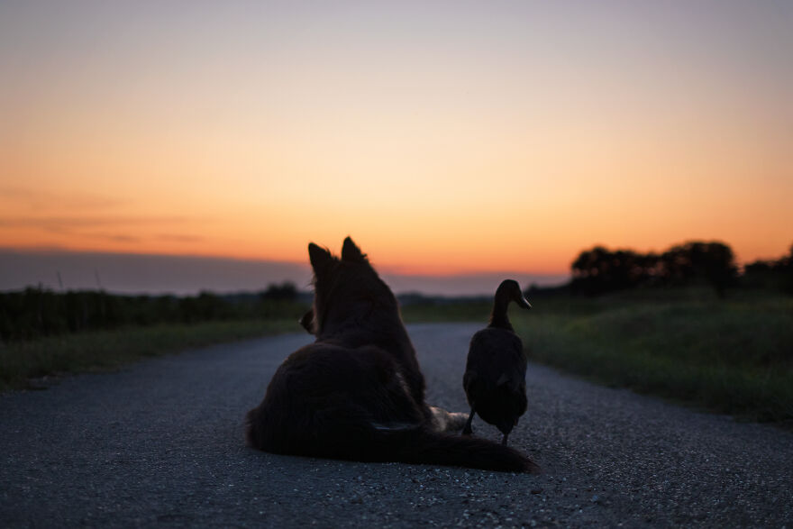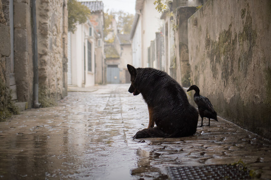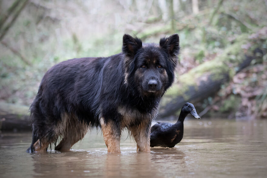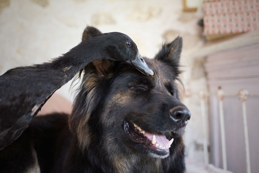 2021年01月28日我們看到過不少動物之間跨物種的友誼,在業餘攝影師Natacha家裡,就有德國牧羊犬Vendetta,印度跑鴨Lemony,還有兩隻鴿子Grisella和Heldig,奇妙的是,牠們都是親密無間的好朋友,一起出鏡時如童話般美好的畫面總是能夠融化人心!