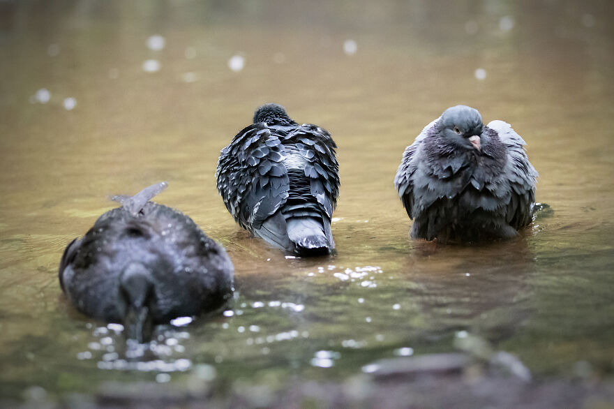 ▼26.鴨鴨和鴿鴿一起玩水。
