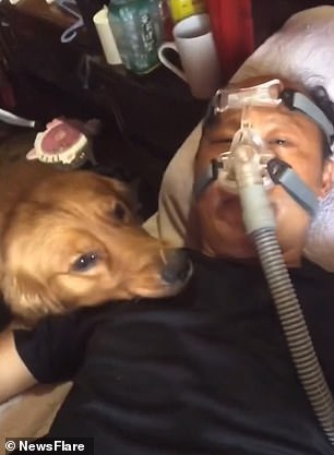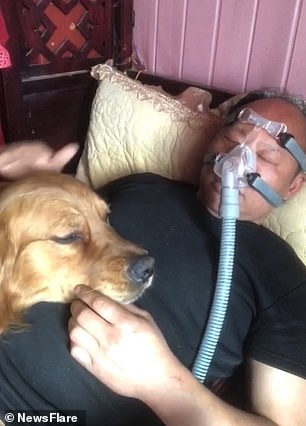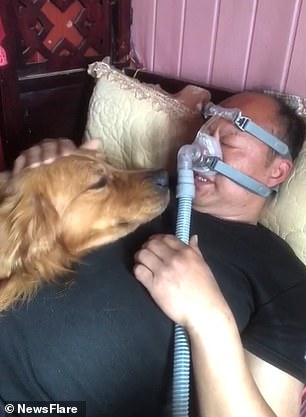 2021年01月31日很多飼主將狗狗當成家人,狗狗則把飼主當成全世界最重要的人~河南新鄉56歲的邵先生養了一隻3歲的金金,邵先生對金金非常好,金金也全心全意愛著主人。邵先生身體不好,患有高血壓和心臟病,有時會心臟驟停,醫生建議他準備家用呼吸機,睡覺的時候就戴上。每次他戴上呼吸機睡覺,金金都會趴在床邊守護,似乎非常擔心他。