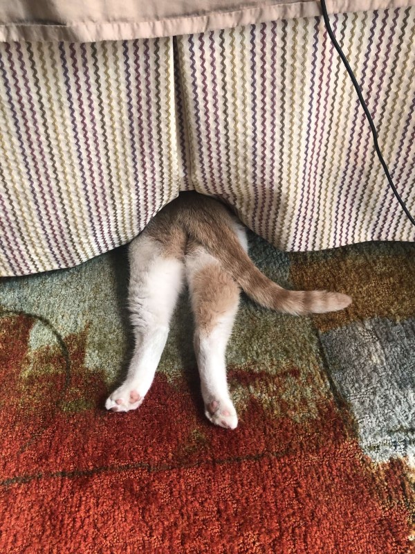 ▼Keanu雖然很擅長捕獵,但不擅長玩躲貓貓。牠習慣躲起來觀察家人的一舉一動,尤其是牠最愛的把拔。但牠的躲藏方式很滑稽,經常藏在家具下,露出自己的小PP,還以為沒有人發現自己。