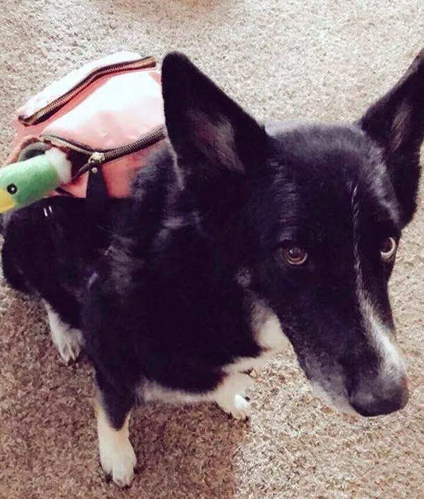 ▼狗狗背著企鵝包。
