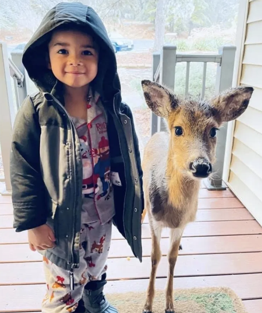 2021年02月01日小朋友跟動物之間有特別的紐帶,他們能彼此理解,成為好朋友~最近維吉尼亞州的一對夫妻帶著4歲的兒子Dominic Brown外出度假,度假期間Dominic和森林中的一隻小鹿成為了好朋友,他邀請新朋友到家裡作客,一人一鹿站在一起的畫面格外療癒。