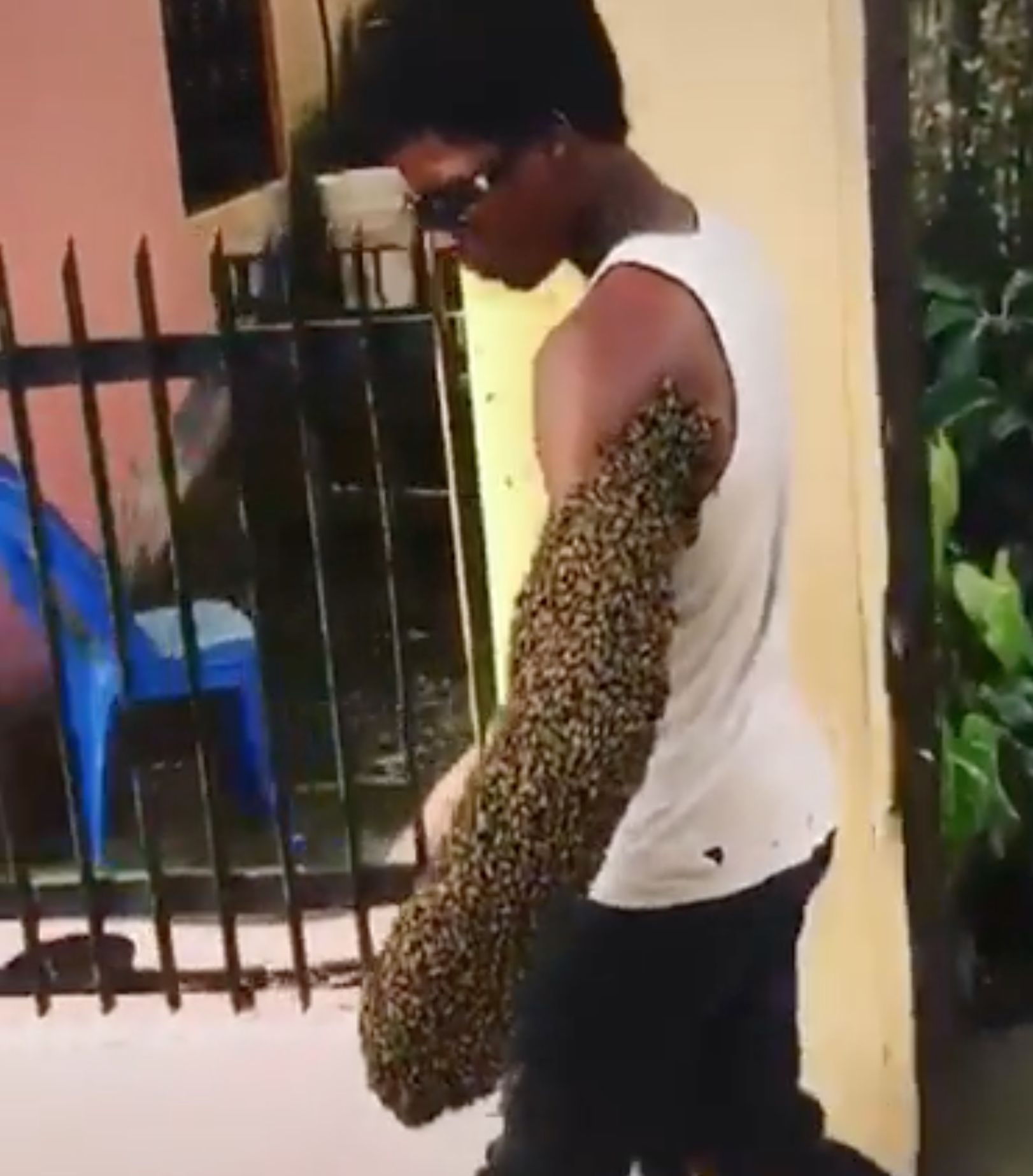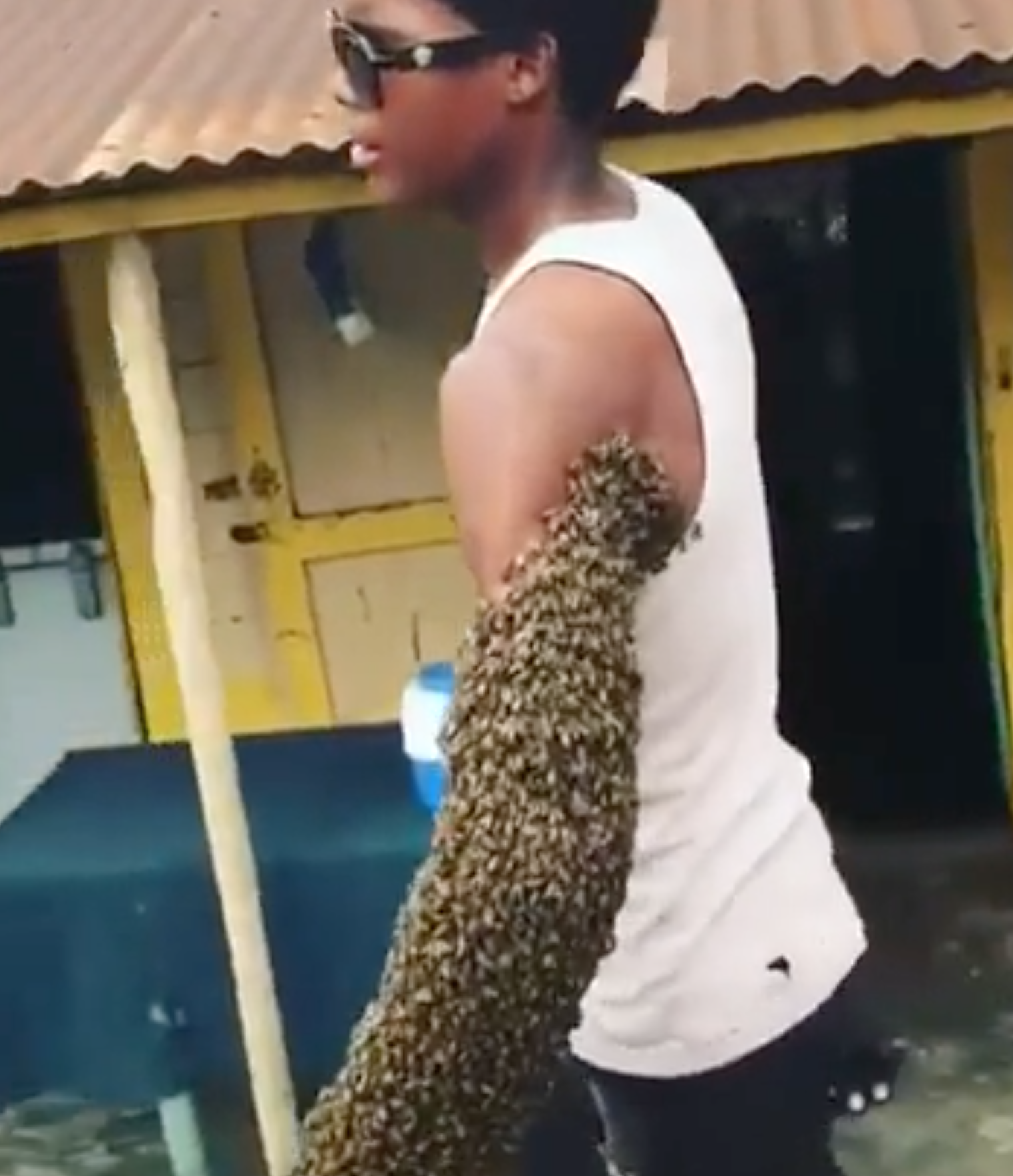 ▼這段影片是在多明尼加拍攝的,這名男子穿著白色背心、戴著黑色墨鏡,有成千上萬隻蜜蜂停駐在他的左臂上。那一幕非常嚇人,但男子毫不在意地走在路上。拍攝者問他:「為什麼不會被螫?」他回答:「我的手裡握著女王蜂,其他蜜蜂都認得自己的主人。」