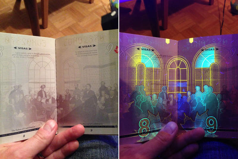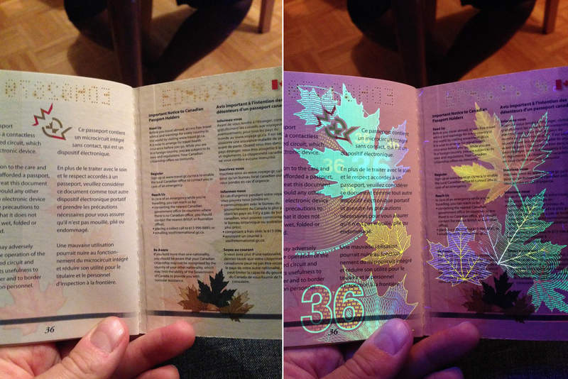 2021年02月02日雖然平時很少用到護照這一證件,但出國絕對少不了它~各國的護照在設計上都不一樣,其中加拿大的護照非常特別,尤其是上面的防偽螢光線,用紫外線燈照射,就顯露出非常美的顏色和圖案。這種防偽技術跟藝術相結合,簡直讓人愛不釋手,捨不得移開視線~