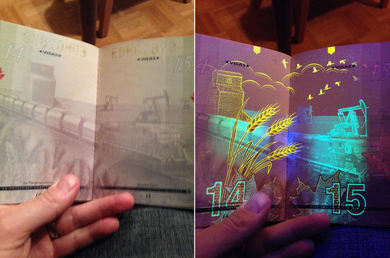 ▼你可能沒注意過護照上的防偽螢光線,仔細看看加拿大的護照,上面的防偽螢光線超級美,不僅有加拿大的特色圖案,還有絢麗的色彩,這設計非常有趣。