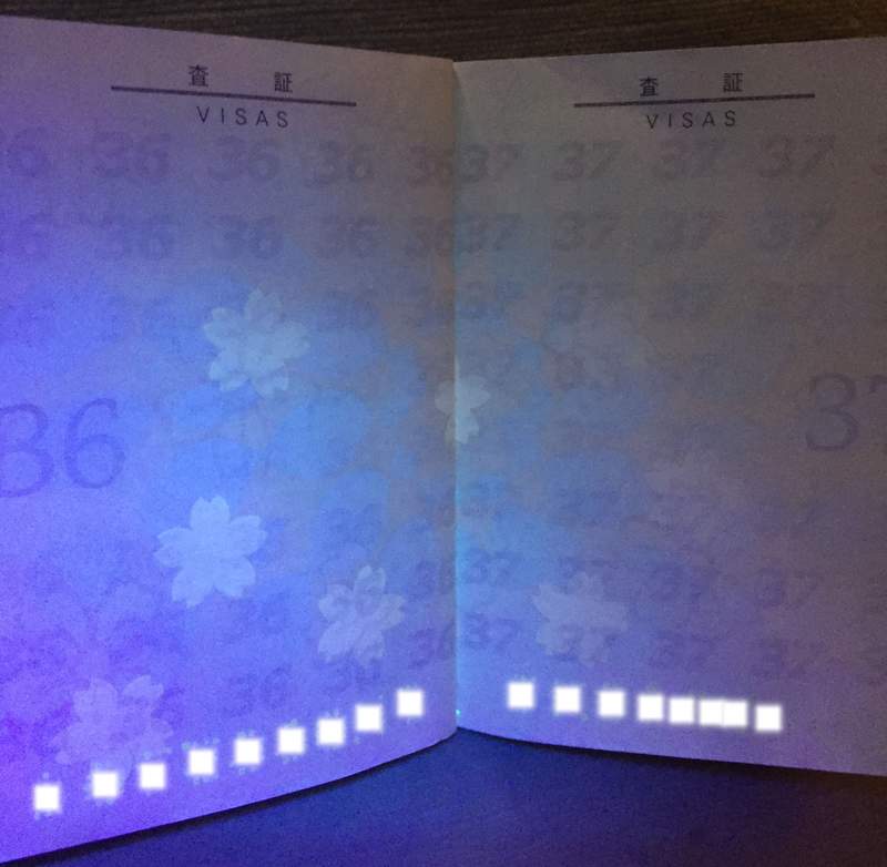 ▼不過並非所有國家的護照設計都那麼巧妙,比如日本的護照,雖然也用上了防偽螢光線,但用紫外線燈照射,顯露出來的圖案就比較傳統。