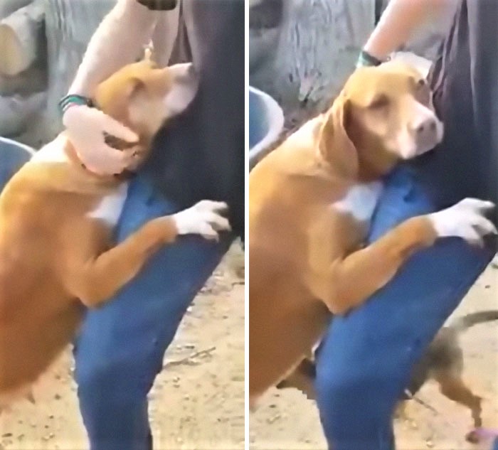 ▼這隻狗狗太熱情,記者實在不忍心推開他,於是任由牠抱著自己,還溫柔地伸手摸摸狗狗的腦袋,回應狗狗的熱情。狗狗見記者有回應,抱得更加起勁了。牠一臉開心,好像找到了主人一樣。這一幕正好被拍了下來。
