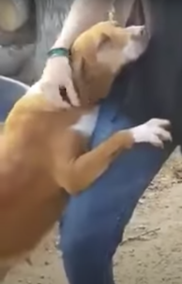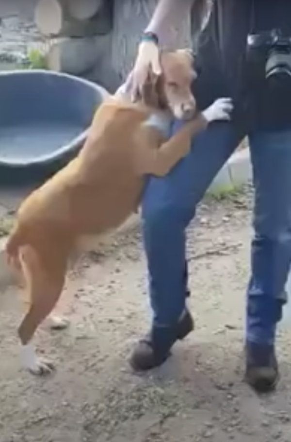 ▼記者是來收容所工作的,手上並沒有零食或玩具。一隻穿著白襪的黃棕色狗狗卻被他吸引,一見到他就飛奔過來,還抱著他的大腿不肯放開。記者摸不著頭腦,他之前明明沒有見過這隻狗狗,也沒有跟牠玩過呀?