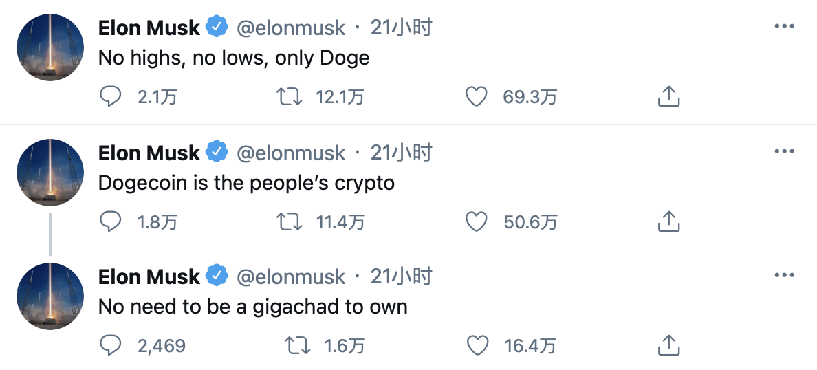 ▼後來他又發了更多推文:「沒有最高,沒有最低,只有Doge。」「狗狗幣是人民的加密貨幣。」「無需成為超級巨星就能擁有。」