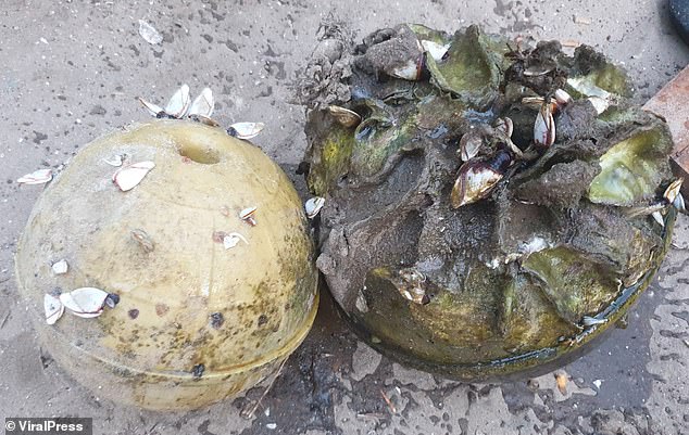 ▼1月27日那天,Hatchai和家人去洛坤府的海邊撿貝殼。他們偶然發現了一個被衝上岸的廢棄浮標,上面附有一些貝類,其中就有3個海螺。