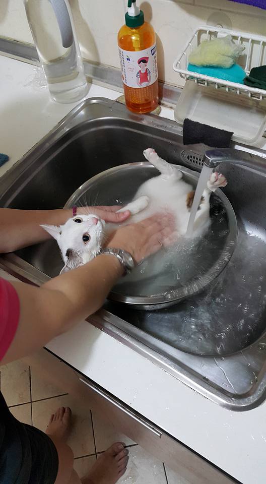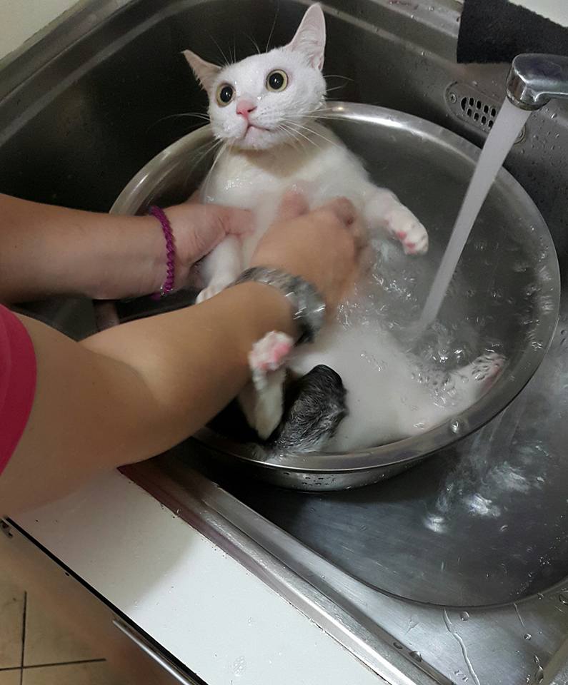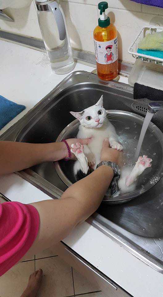 乖得像是洗菜!天菜貓「乖乖躺鍋裡」張圓圓眼 任搓澡舒服到開掌花