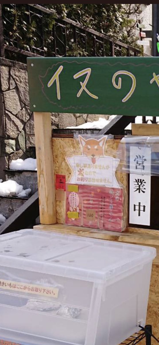 ▼主人特別在地瓜攤門口標明,地瓜每份100日圓,還設置投錢箱,並在另一個牌子上以Ken的口吻寫道:「很抱歉,因為我是狗狗,所以我不會找錢。」