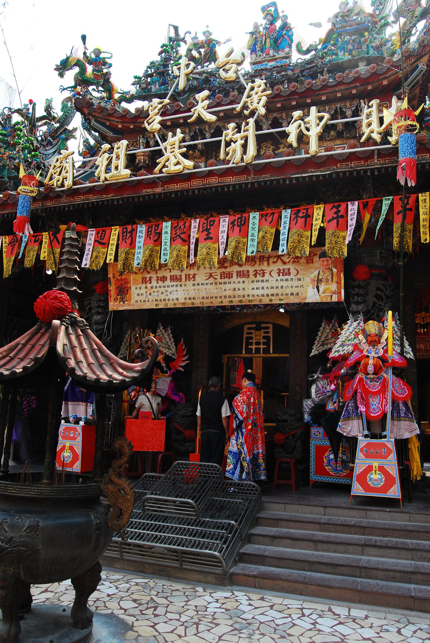 ▼台北市的松山霞海城隍廟,是股票人最愛的財神廟,主祭祀城隍爺,配祀五路財神。據說過去曾發生過股票人拔了財神爺的鬍鬚,結果化解了股票危機,在這之後,許多人變去廟裡偷拔鬍鬚,使神像嚴重毀損,而廟方也想出應對措施,在每年農曆三月十五日財神誕辰,會有真人扮成財神,供信徒們摸摸鬍子祈求好運!