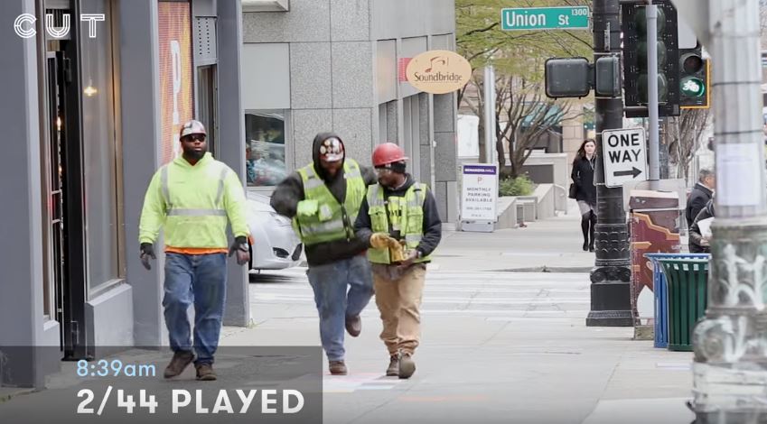 ▼一群建築工人路過,看到地上的格子後開心玩了起來,他們笑得像一群大孩子。