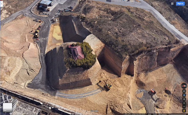 ▼網友們覺得這座建築是神社的可能性比較大,但很快就有其他鄉民說不是神社,更像一座住宅。這可能是「釘子戶」,地主拒絕搬遷,或者不接受開發商的補償金,開發商不能依法拆除房屋,只能繞過這座建築施工。但是另一位網友發現,這個工地已經呈現這一模樣好長一段時間,不像正在開發的樣子。