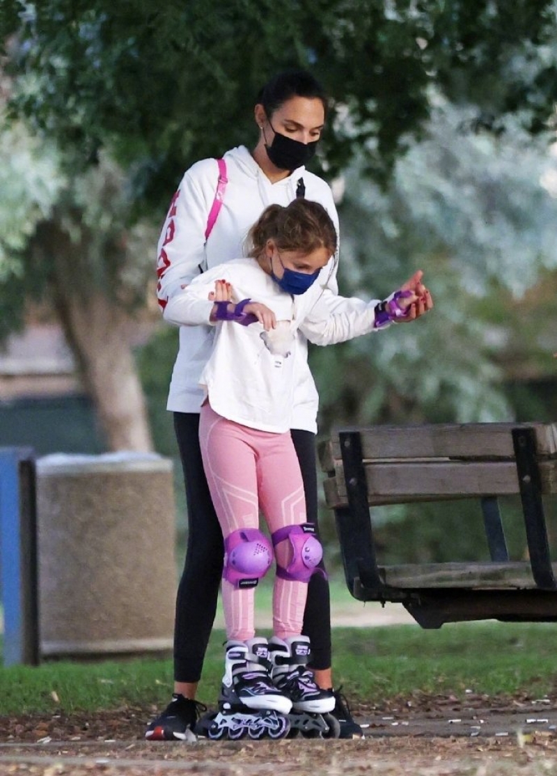 ▼蓋兒加朵身高178公分,她身形纖細,但線條緊實,因為有運動的習慣,看起來非常健康、充滿力量感。最近她在美國加州Studio City,帶著9歲女兒Alma出門溜滑輪。母女兩人都戴著口罩,蓋兒加朵穿著簡單的運動裝,健美的身形非常亮眼。