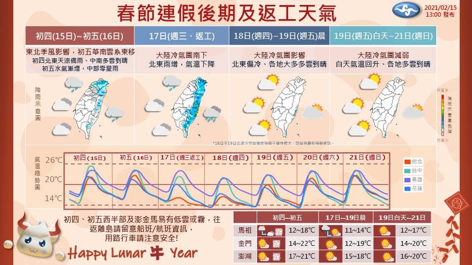 明天是開工日,但並沒有好天氣。氣溫驟降、愈晚愈冷。明晚北台沿海平地最低可能降至10度左右;北部和東半部有局部雨,晚上北台雨停。濕冷不到1天就轉乾冷。從週四(18日)起,連續5天各地天氣晴朗穩定,但清晨以「晴冷」為主。