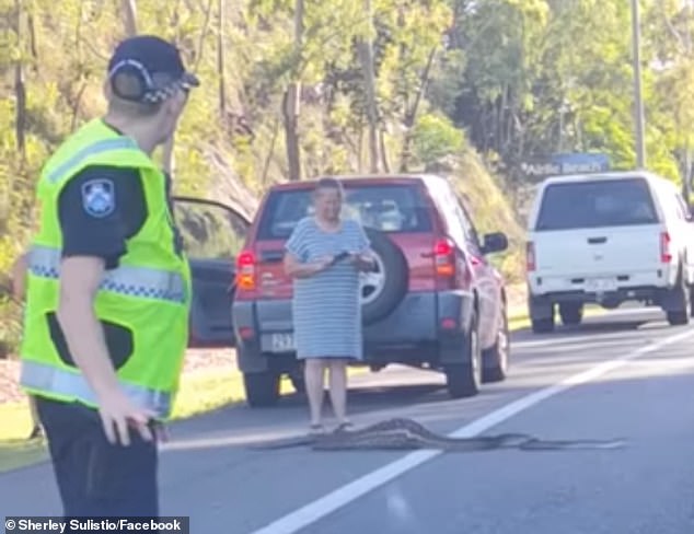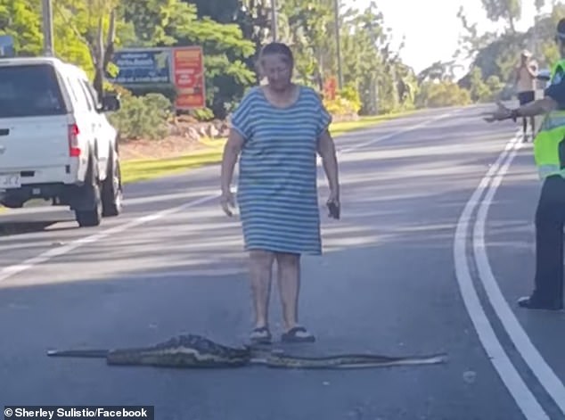 ▼Sherley說:「幸好他們攔下了我,讓我能夠拍到這一幕。那條蟒蛇大概有3公尺長,牠最後安全爬到了馬路另一邊。」
