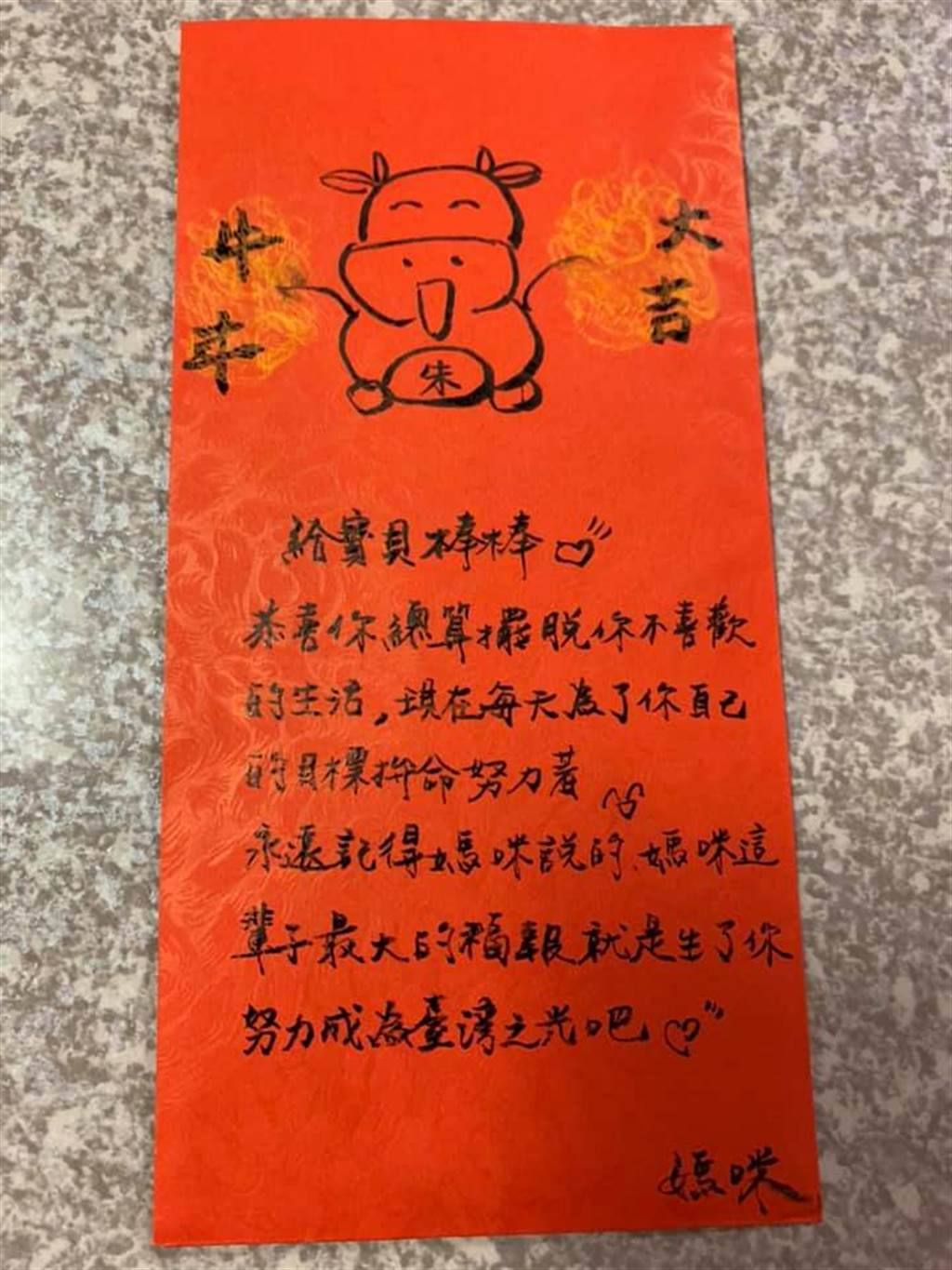 ▼從原po分享的紅包照片可以看到,她在紅包袋上畫下可愛的牛牛圖案,並寫道:「恭喜你總算擺脫你不喜歡的生活,現在每天為了自己的目標拚命努力著,永遠記得媽咪說的,『媽咪這輩子最大的福報就是生了你』,努力成為台灣之光吧!」