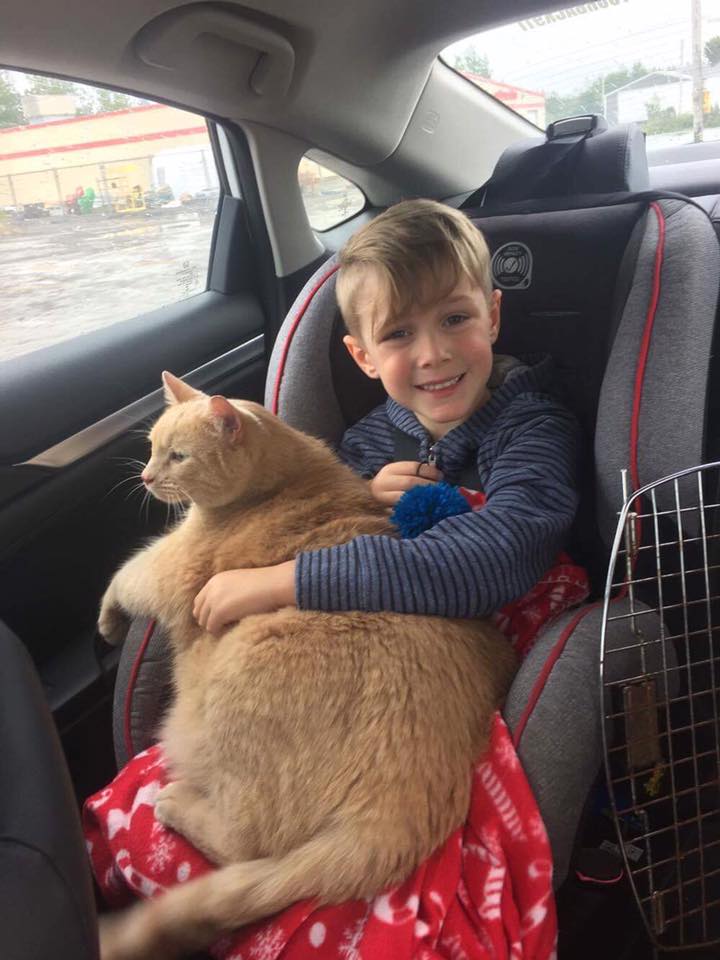 ▼Easton看到這隻胖乎乎、體型巨大的貓咪後,立刻被牠吸引。回家的路上,Tiny從籠子裡出來,親暱地依偎在小主人身上。有牠對比,Easton顯得嬌小了很多。