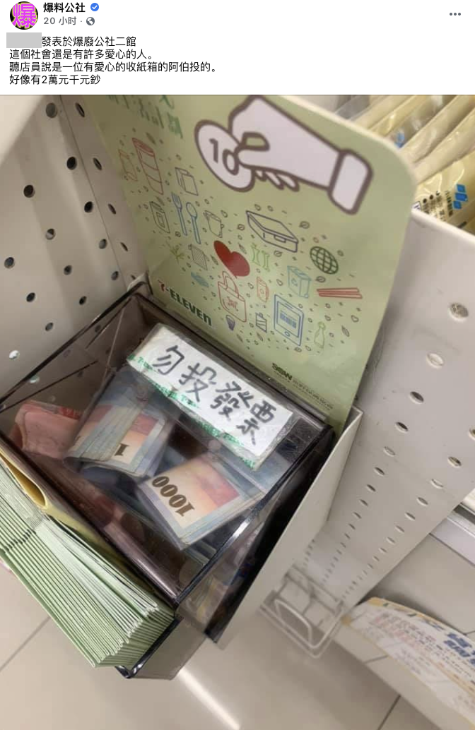2021年02月25日超商結帳櫃檯前往往會有零錢募款箱,很多客人會將零錢隨手塞進去。日前一名男朋友在臉書社團「爆料公社」分享,他去超商時看到零錢箱裡塞滿一整疊千元鈔。他問過店員才知道,塞這一疊鈔票的人竟是一名收紙箱的善心阿伯~