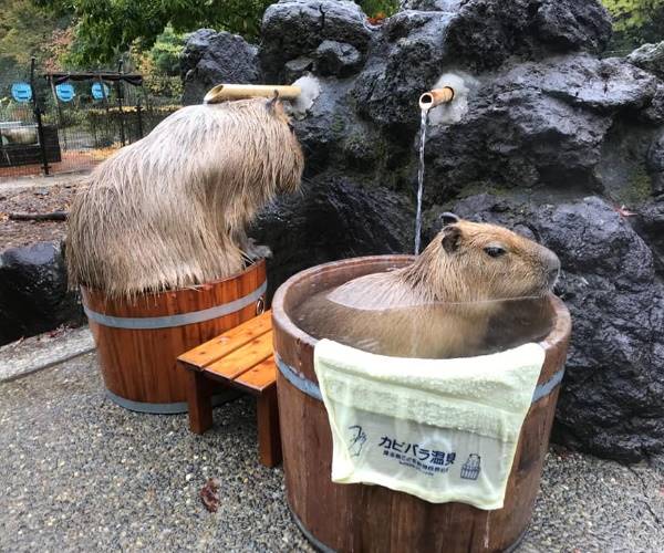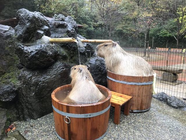 水豚也迎來溫泉祭 網抓包旁邊那隻「硬塞木桶」大笑:會擠到變形啦!