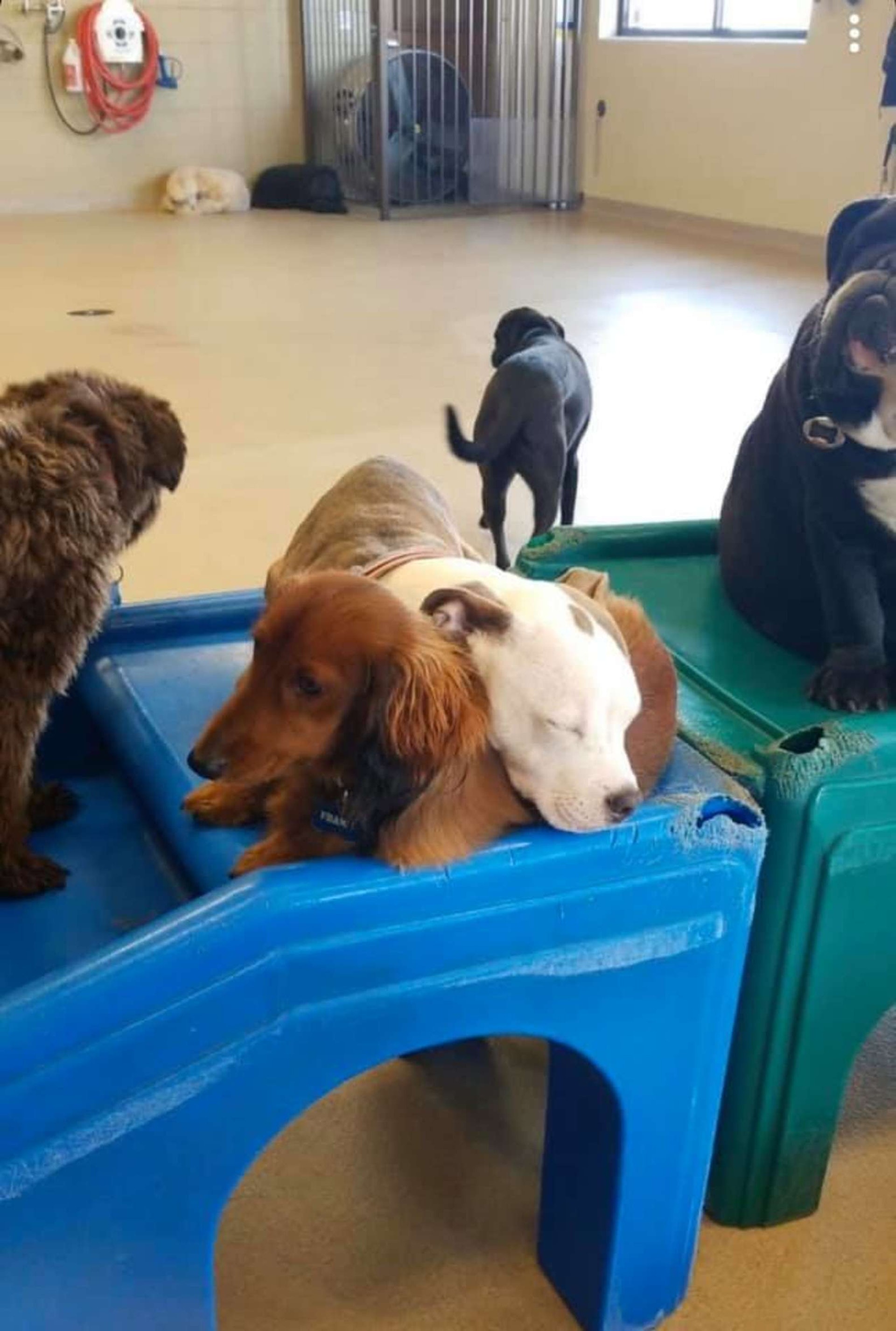 ▼Gottfried說,她每次去日托中心接狗狗回家,都看到Edna趴在其他狗狗身上睡覺。「為了帶Edna回家,每次都要把牠先叫醒,但這樣不免會吵聲被牠壓着的狗狗,實在有點不好意思。」