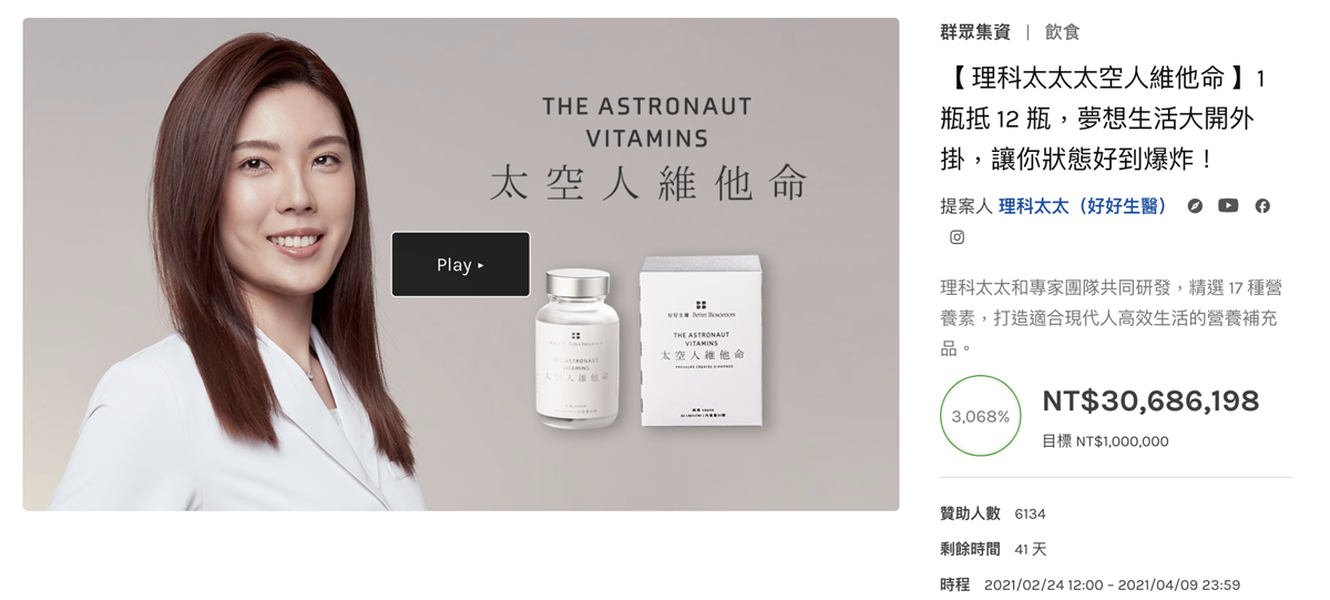 ▼理科太太還在「嘖嘖」上發起群聚集資,推出「理科太太太空人維他命」。其中最便宜的「一飛衝天組」要價1830元,內含一瓶60粒的維他命、成分說明書和感謝卡;最貴的「九十六萬分感謝組」要價13萬7760元。這一群聚資源短短1天就募到1700多萬元,而且還在增長中。贊助者預計於今年5月能取到貨。