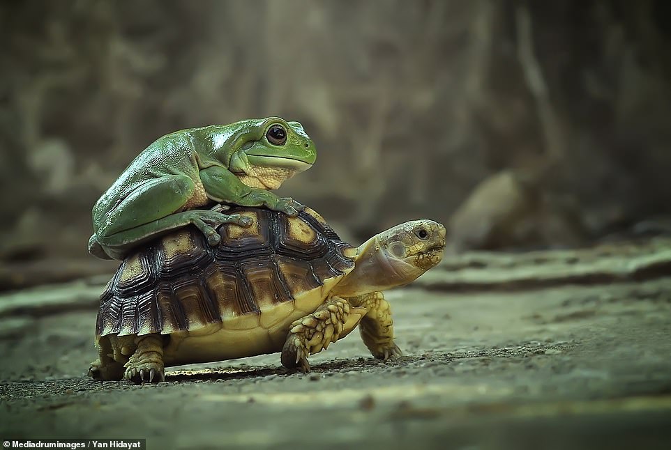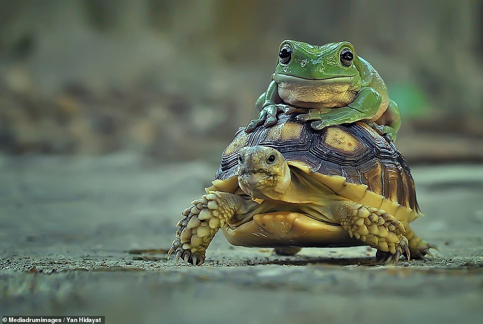 2021年03月03日動物之間的友誼經常能給人帶來驚喜!不久前印尼攝影師Yan Hidayat在野外拍到了有趣的一幕,只見一隻小烏龜的背上居然坐著一隻小青蛙。這兩隻動物都很淡定,好像已經習慣了這樣的相處模式。不知道牠們想要結伴去往什麼地方呢?這簡直就像童話故事裡的畫面。