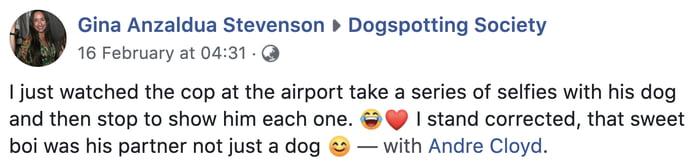 ▼Gina表示:「我確信,這隻可愛的狗狗對他來說不只是警犬,還是他的最佳拍檔。」