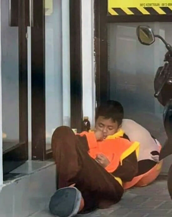 ▼從影片中可以看到,一名「布偶工讀生」正坐在路邊低頭休息,工讀生拿下頭套,大家才發現那是一個小男孩。這個孩子叫Rehan,年僅9歲,他家境不好,從小跟媽媽相依為命。為了幫媽媽減輕經濟負擔,他每天早上天還沒亮,就要穿上厚重的玩偶裝出門工作。