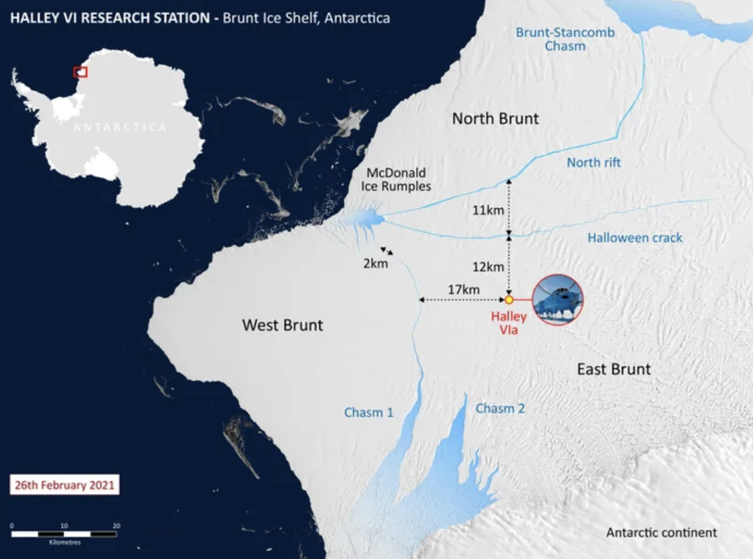 ▼Francis教授表示:「就算在南極洲的冬天,極夜的時候,科考站附近的溫度降到零下50攝氏度,周圍一片漆黑,我們也能知道冰架的變化。在接下來的幾週或幾個月裡,這些斷裂的冰山可能會漂移,也可能在布倫特冰架附近擱淺。哈雷研究站位於活躍冰架附近,如果這次斷裂導致科考站周圍環境的變化,GPS可以提前發出預警。」