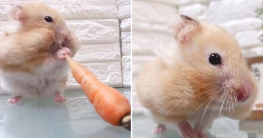 2021年03月05日日本有一隻可愛的黃金倉鼠,牠不僅外表很萌,還具備吃貨資質!這隻小倉鼠最愛吃紅蘿蔔等蔬菜,而且進食的速度超級快。牠能在眨眼間吞下跟自己的身體差不多大小的紅蘿蔔,就像變魔術一般。主人將牠大啖紅蘿蔔的照片、影片po到網路上,網友們都覺得超治癒。
