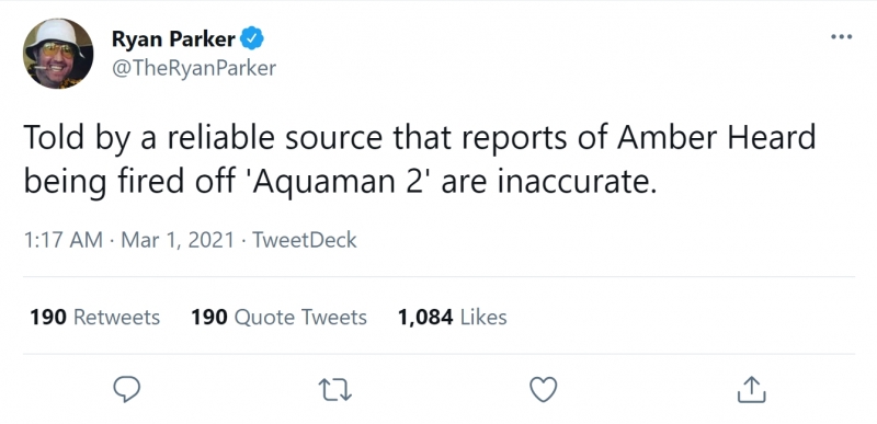 2021年03月04日好萊塢男星強尼戴普(Johnny Depp)和前妻安柏赫德(Amber Heard)的婚變消息鬧得沸沸揚揚。強尼戴普的事業大受影響,失去《怪獸與他們產地》中的葛林戴華德一角;安柏赫德則要繼續出演《水行俠2》的梅拉這一角色。強尼戴普的粉絲們忿忿不平,沒想到近日好萊塢權威媒體《The Hollywood Reporter》的記者竟透露:「安柏赫德已經被DC開除了!」
