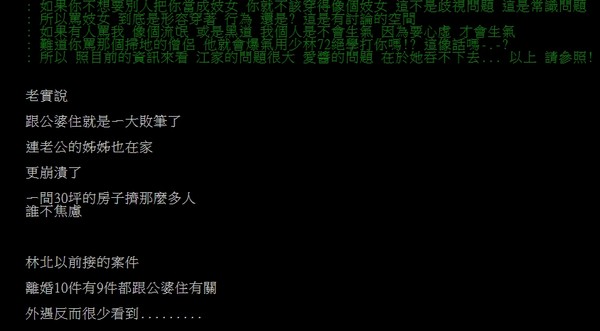 ▼原po進一步說,台男真的很奇怪,有些人明明收入不差,買房租房都不是問題,卻堅持要跟父母住在一起,再把老婆拖來一起住。他分享過去接手的一個案例,一對從大學交往到研究所的年輕夫妻,2人還分別出國再念一個學位,學成歸國後結婚,沒想到不到3年就吵得天崩地裂。
