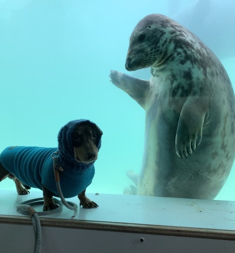 認錯了啦!呆萌海豹見「戴帽子臘腸犬」以為是同類 隔玻璃搭訕:你怎麼不用在水裡?