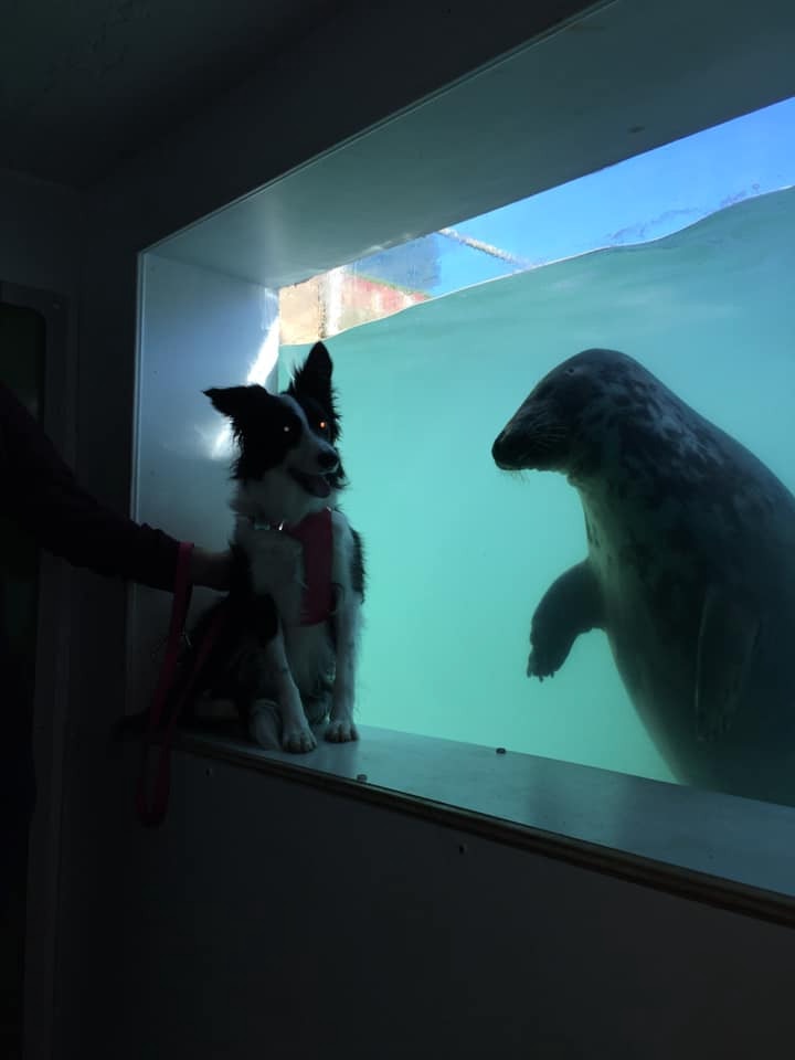 ▼當時天氣比較冷,Melanie就給狗狗穿上了一件藍色的連帽外套,狗狗的耳朵被遮住,從遠處看很像海豹寶寶。大概就是因為這樣,海豹Aayla把牠當成了同類,哪怕隔著玻璃也要跟牠互動。