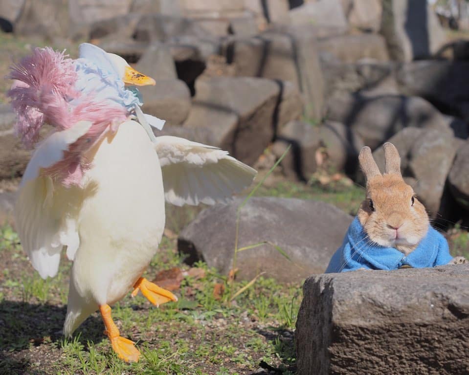 ▼主人經常讓Cookie和Haru見面、一起玩。兔兔Cookie穿上可愛的小衣服,就像彼得兔一樣,好像下一刻就要開口講話。鴨鴨Haru戴上優雅的圍巾帽子,也有不一樣的風情。