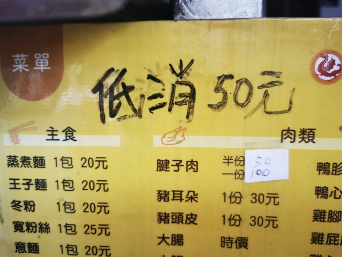 老闆的滷味攤上明確寫著低消金額,至少要夾到50元,而且寫在非常醒目的地方。老闆說,客人點餐時如果身上的錢沒有帶夠,他一般都會說「沒關係,以後再拿來」,至於以後會不會拿來,他並不在意。網路上流傳的「國中生買滷味」事件可能是惡意中傷,老闆覺得非常委屈。