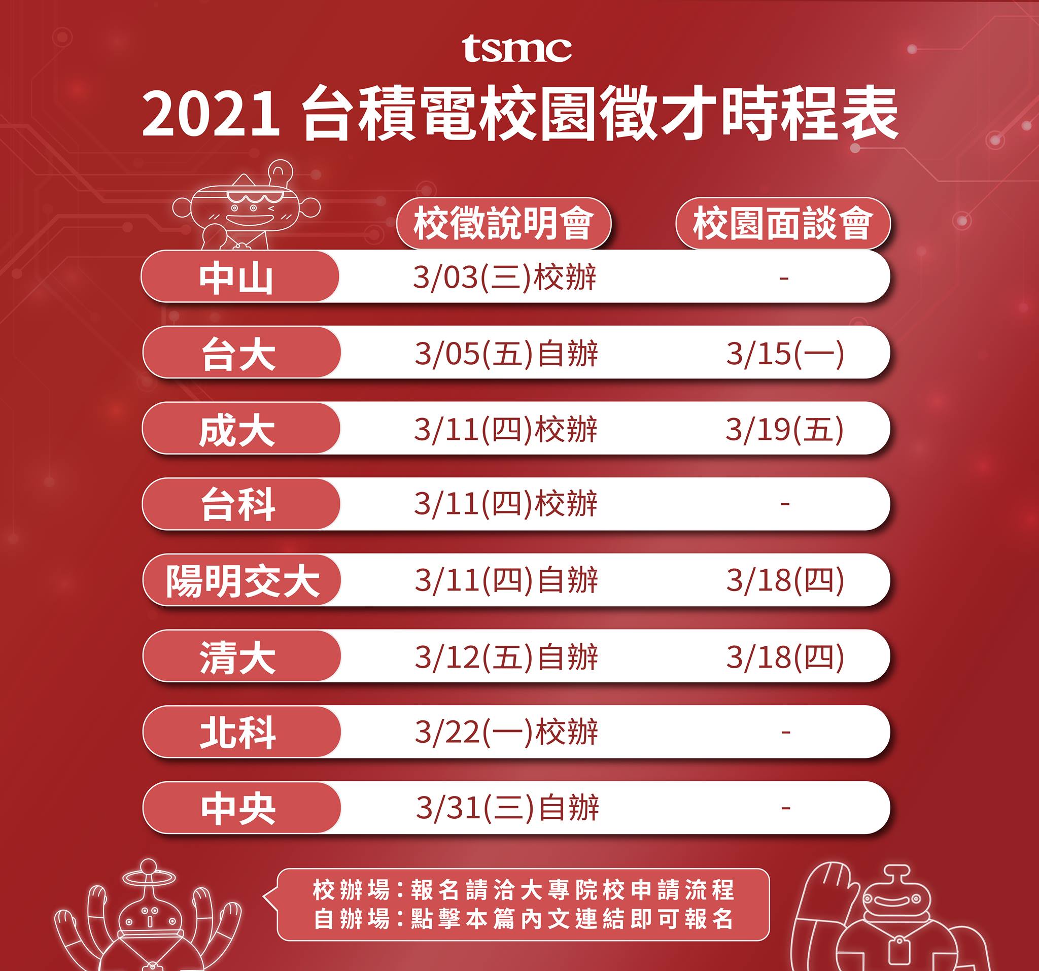 2021年03月08日台積電2021年校園徵才活動已經開始啦!除了深入大學校園舉辦徵才說明會,還會舉辦校內面談會。台積電今年預計徵才電機、電子等科系8千到9千名人才,新員工的起薪比往年大幅提高20%,讓人超心動。