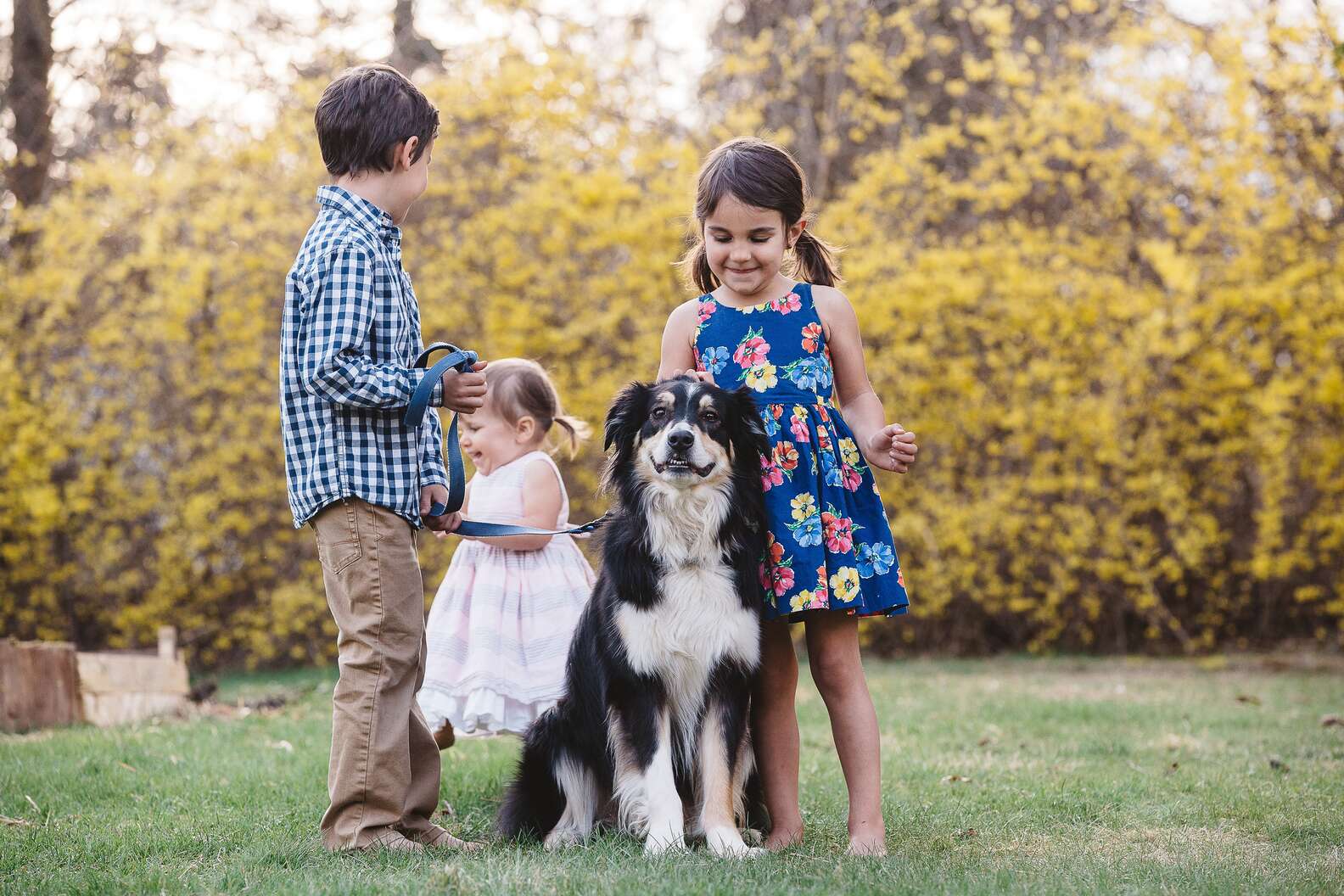 ▼有一天Molly決定再嘗試一下,她讓孩子們乖乖坐好拍照。那天Ruger格外乖巧,牠立刻坐好、看向鏡頭,而且臉上還露出了燦爛的笑容。Molly讓孩子們學學Ruger,好好拍照,但孩子們根本不聽。Molly最後拍到了一張「乖狗狗+調皮小孩」的合照。