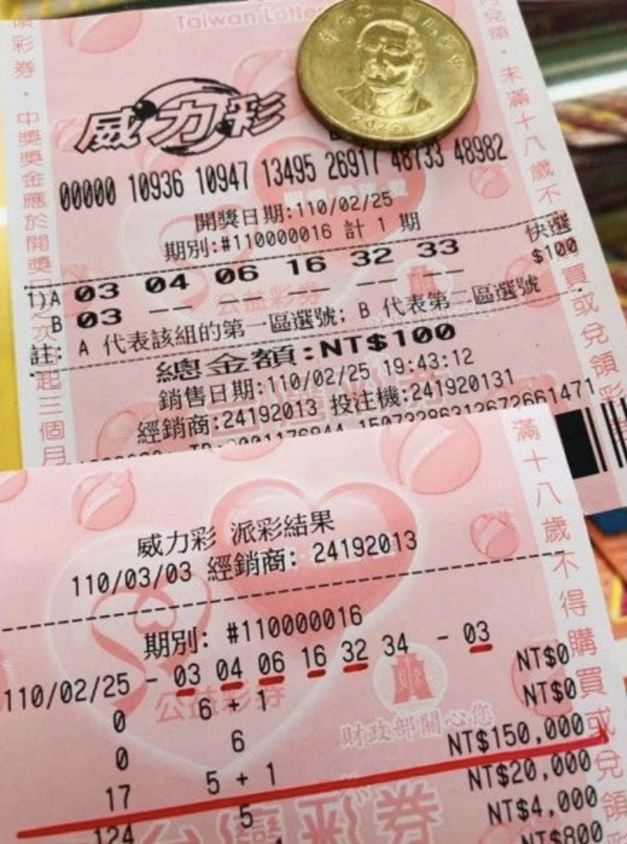 ▼這名網友看到威力彩連槓27期,於是在2月25日到彩券行買彩券。那一期開出第一區為03、04、06、16、32、33,第二區為03。他的中獎號碼第一區為03、04、06、16、32、34,第二區為03,只差一個號碼,眼睜睜看著7億獎金飛走,縮水變成了15萬,還要扣稅。