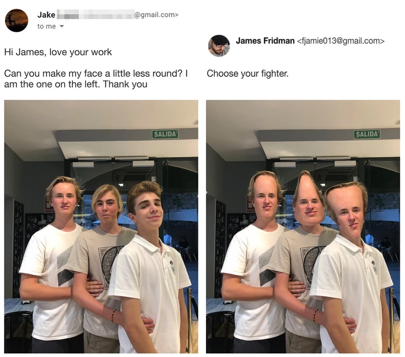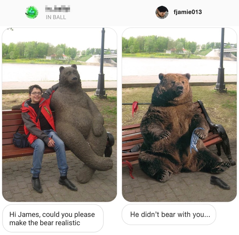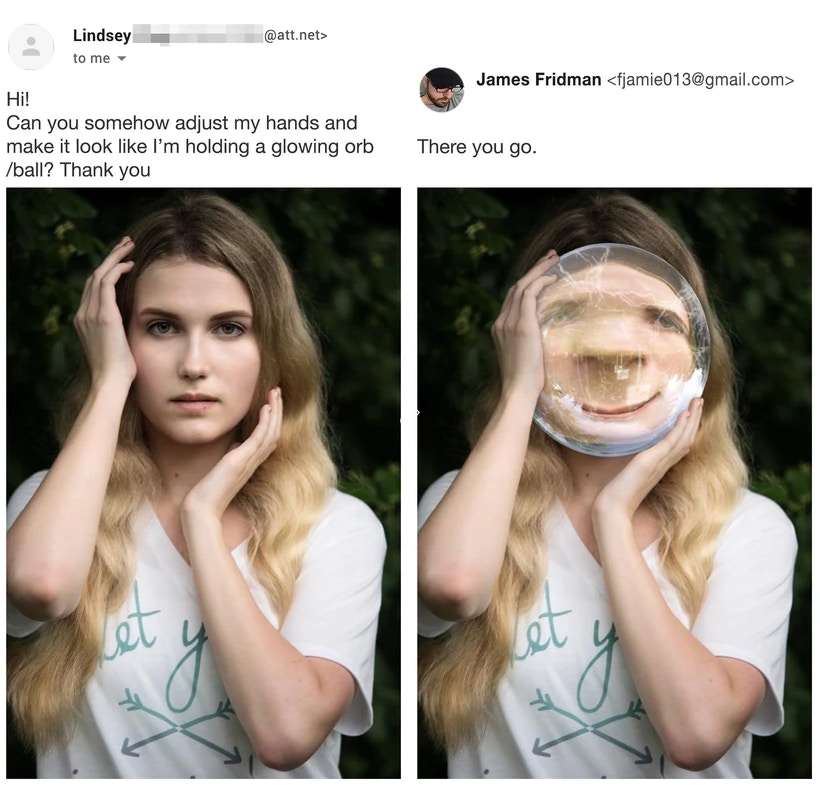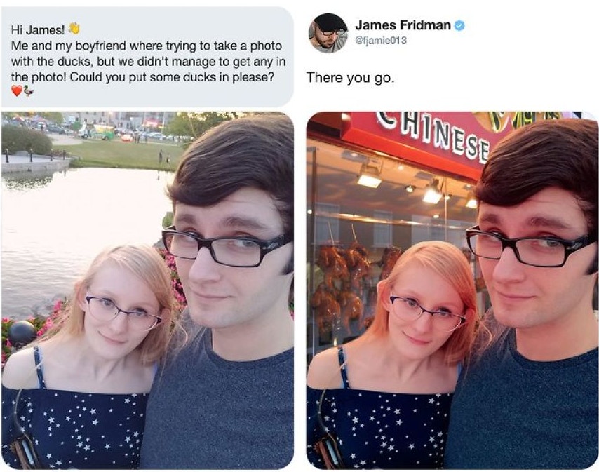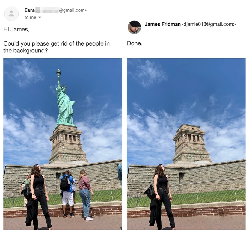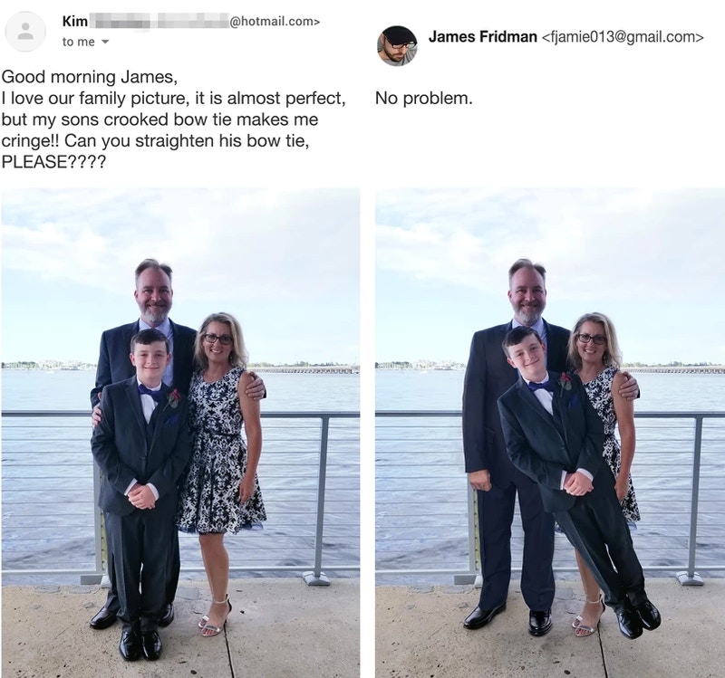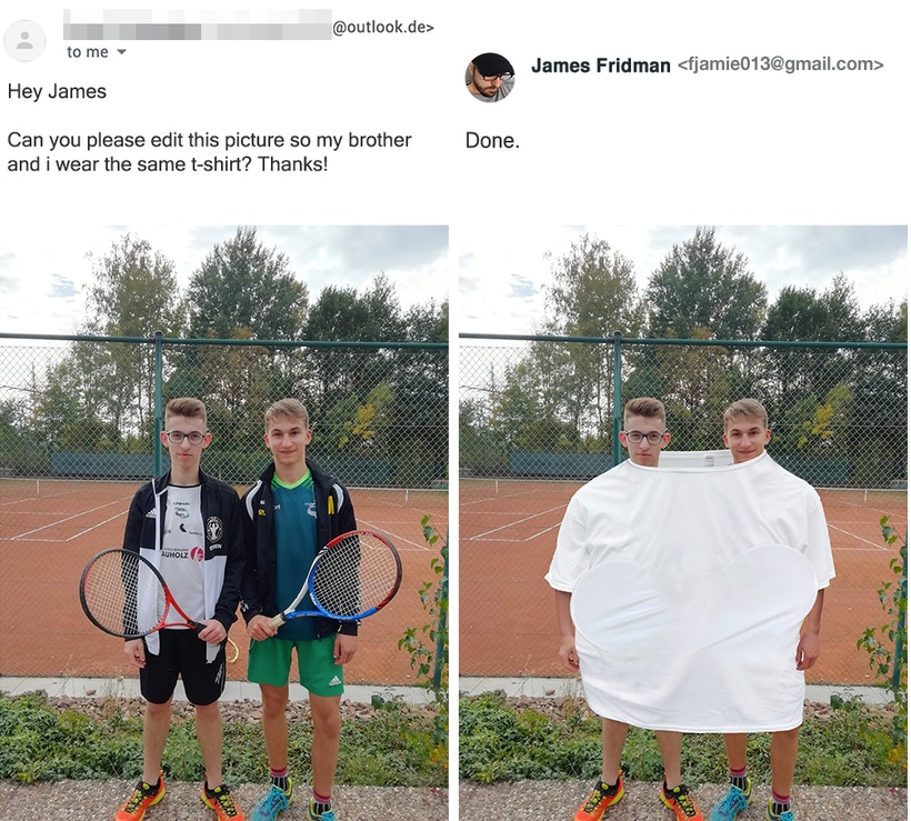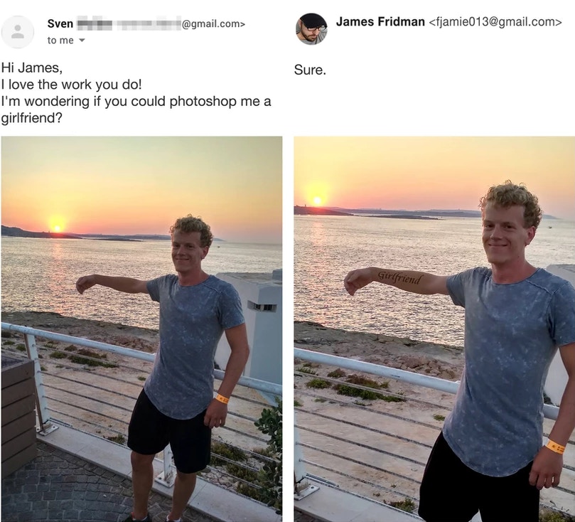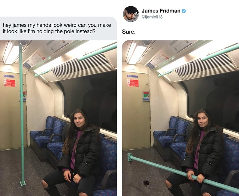 2021年03月09日很多人都會改圖,但想改得自然,還是要看專業人士操作!英國設計師James Fridman經常受網友委託,免費為照片進行後製。網友們的要求五花八門,比如P走背景中的路人、讓自己好看一點等等。James總是能用另類的方式滿足大家的要求,雖然跟照片主人想要的結果不同,但非常好笑~