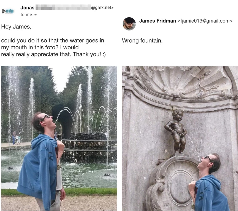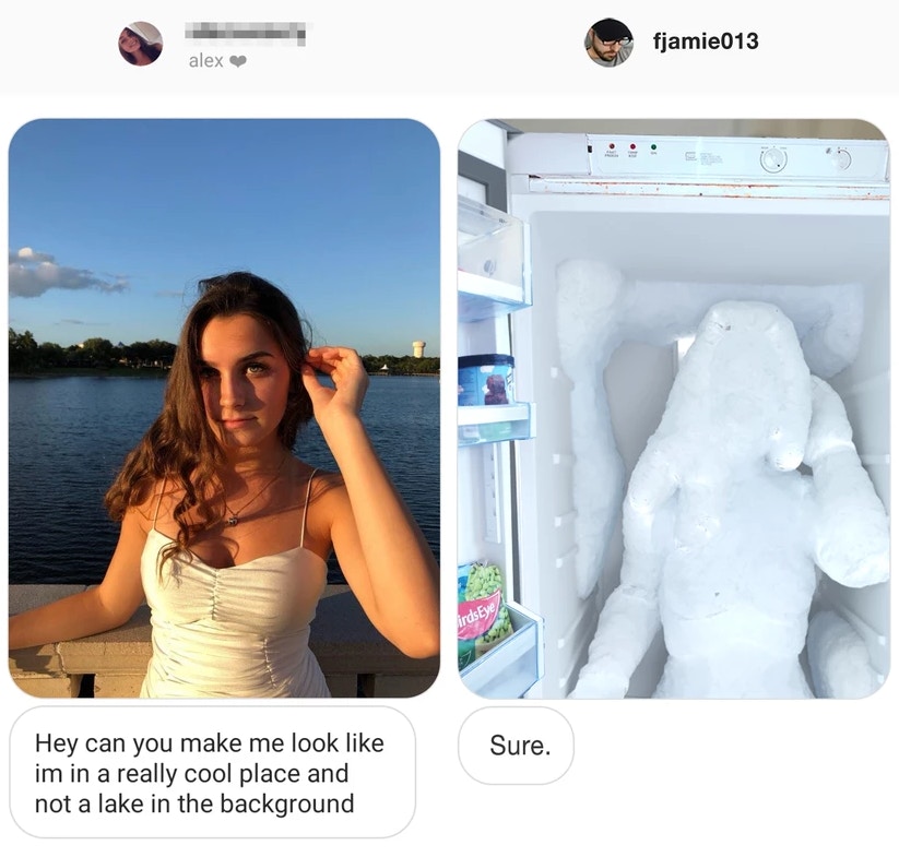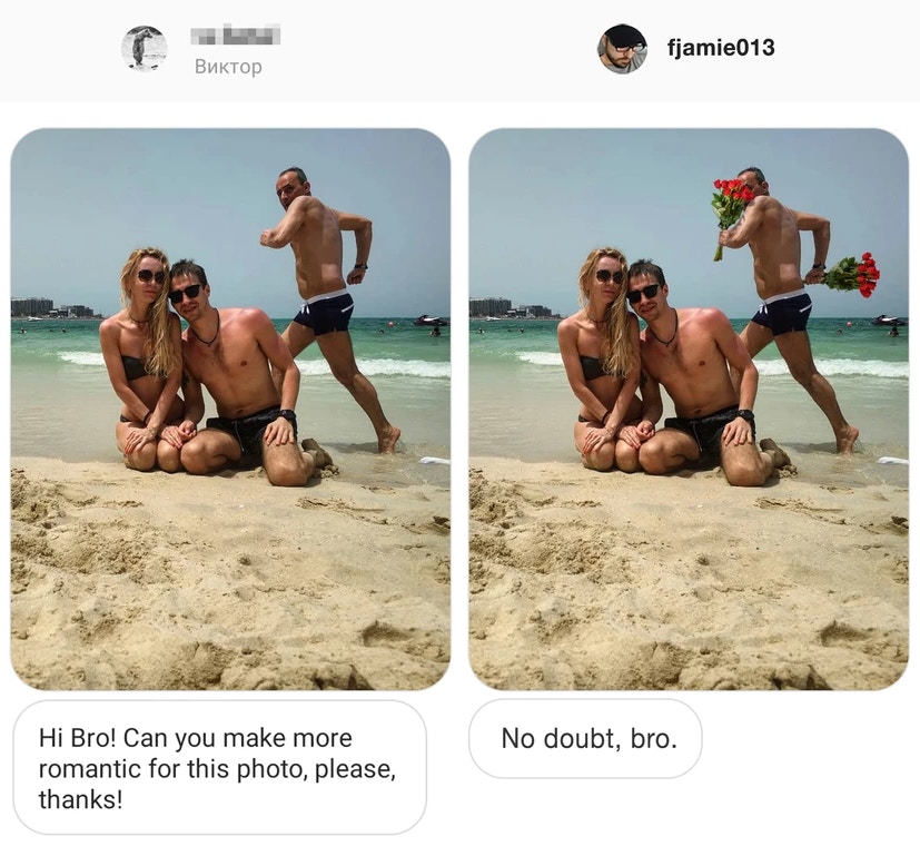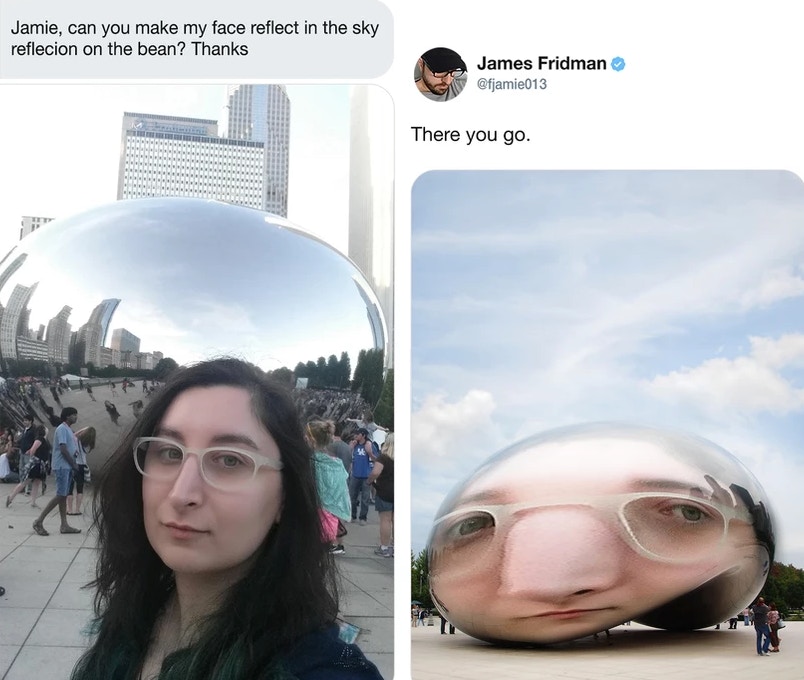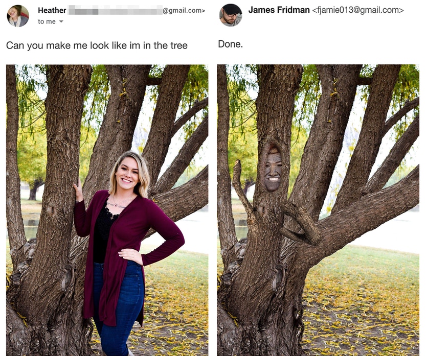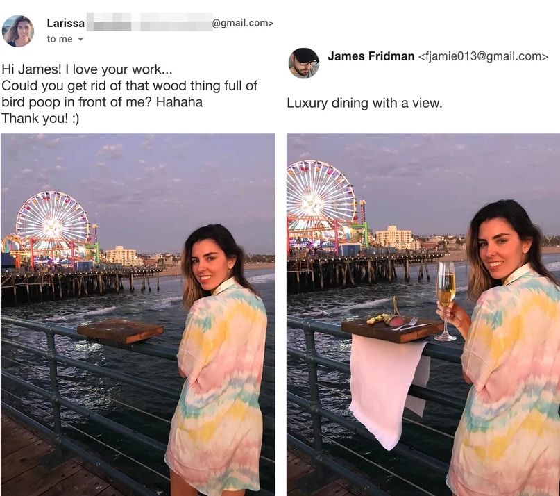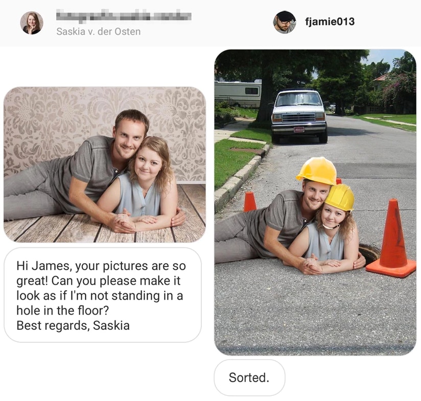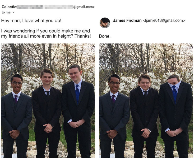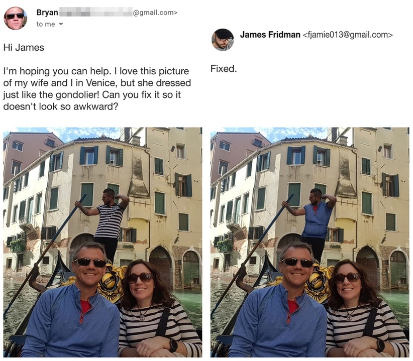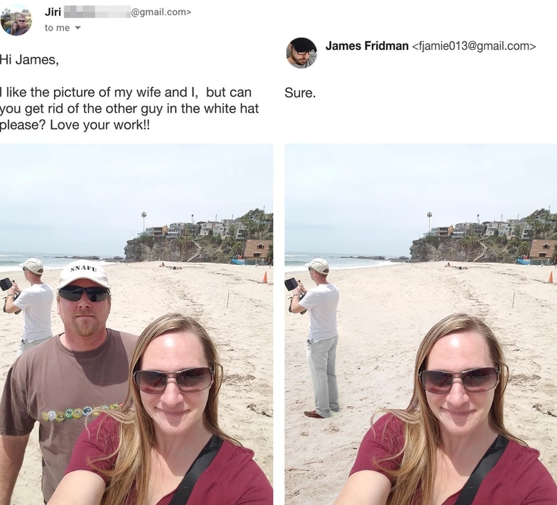2021年03月09日很多人都會改圖,但想改得自然,還是要看專業人士操作!英國設計師James Fridman經常受網友委託,免費為照片進行後製。網友們的要求五花八門,比如P走背景中的路人、讓自己好看一點等等。James總是能用另類的方式滿足大家的要求,雖然跟照片主人想要的結果不同,但非常好笑~