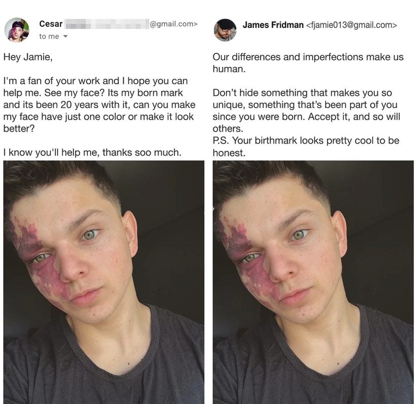 ▼「能幫我P走右眼上的紅色胎記嗎?它跟了我快20年了。」這次James沒有再搞笑,而是認真回覆說:「我們是人,所以都有不同和不完美的地方,沒必要把那些讓我們顯得獨特的東西隱藏起來。」