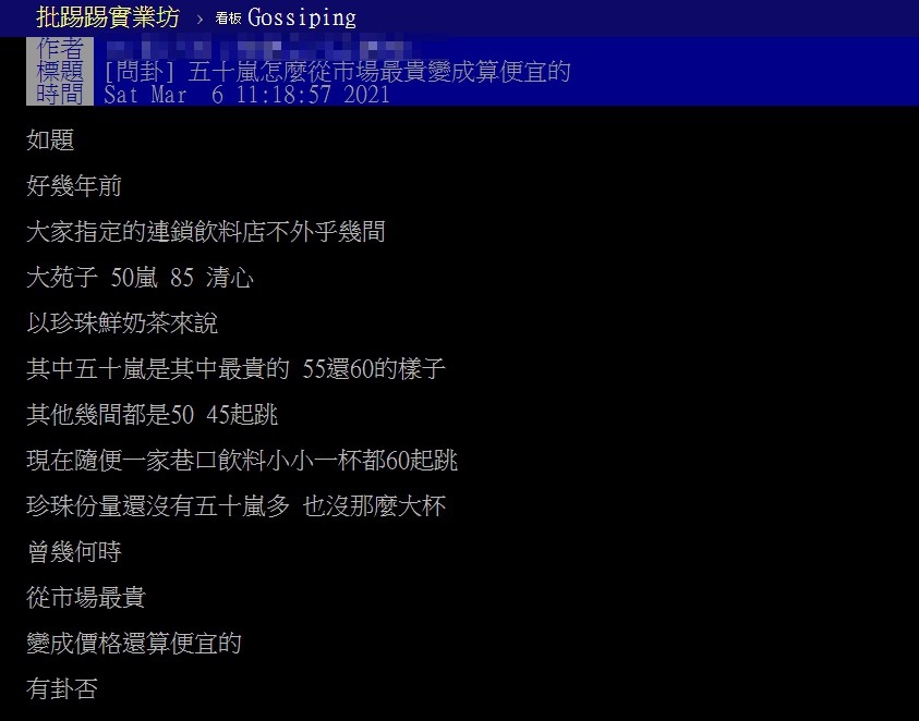 ▼原po以「50嵐怎麼從市場最貴變成算便宜的」為題發文。他表示好幾年前,人氣高的飲料店有大苑子、50嵐、清心等等。以珍珠鮮奶茶來說,50嵐的價格是最高的,比其他家要貴5到15元。當時一杯飲料超過50塊就覺得有點貴了,現在隨便一家飲料店,小小一杯都要60元,而且份量可能比不過50嵐。
