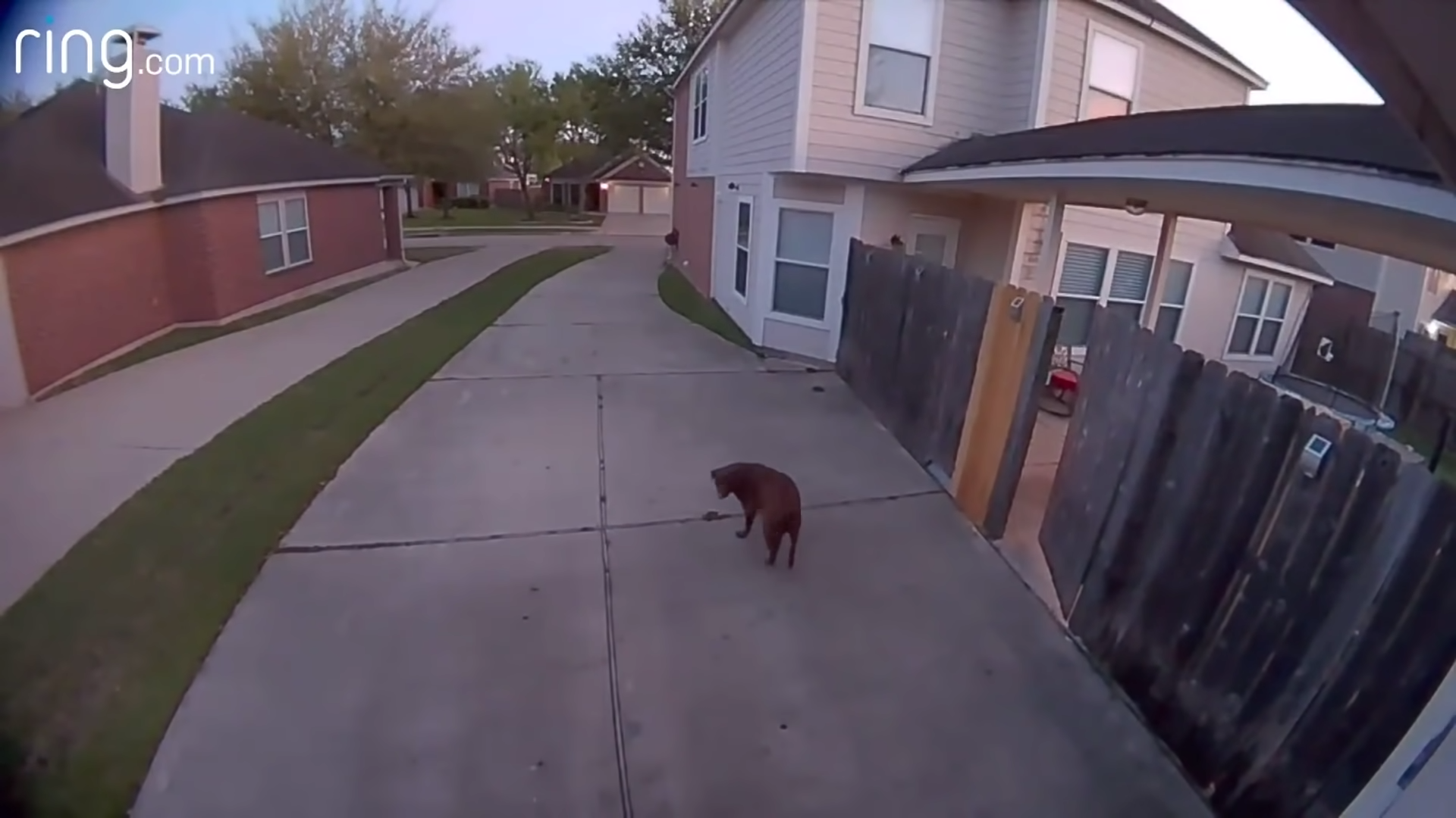▼Sadie溜出門後,站在門口對著空無一人的街道汪汪叫。牠可能在呼喚自己的狗狗夥伴們,邀請牠們加入自己的冒險之旅。Sadie以為自己的計劃天衣無縫,主人絕對不會發現,但牠不知道主人在後門安裝了監視器,牠的所有行為都被主人看在眼中。
