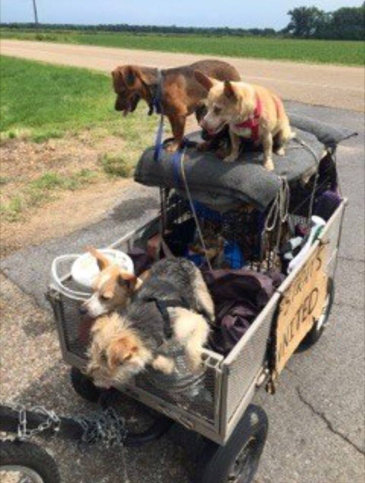 ▼Steve和流浪狗相依為命,2015年時他準備從加州前往印第安納州探望朋友。這一路要走2300公里,基本是橫跨3/4個美國。Steve不忍留下狗狗獨自離開,也不想將牠們送到收容所,於是帶著11隻浪浪上路。他沒有錢買車,就用拾荒撿來的自行車、購物車拼成一輛小車,載著狗狗們出發。