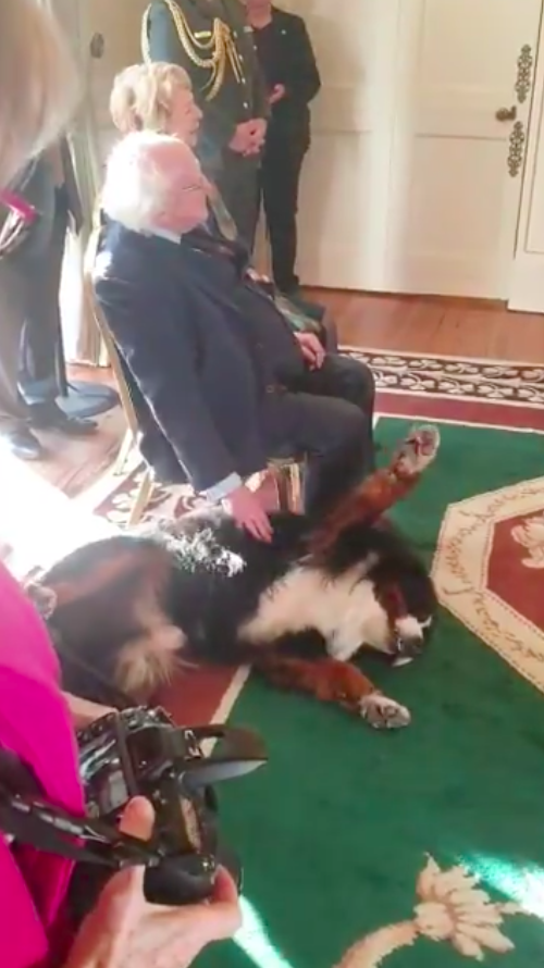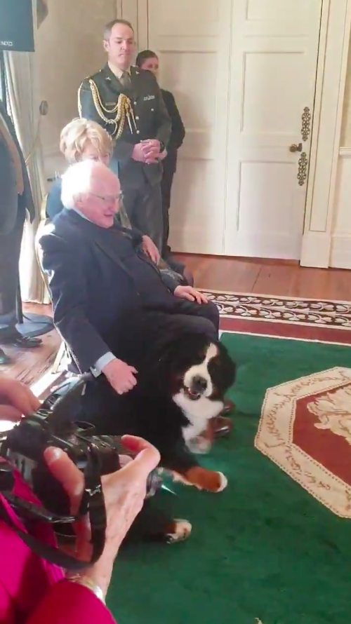 2021年03月19日愛爾蘭元首Michael D. Higgins非常愛狗,他養了兩隻狗狗,不管什麼場合、不管做什麼,只要能帶就會帶著狗狗一起。3月8日這天,在國際婦女節招待會上,Higgins帶著愛犬Bród來到現場。Higgins輕鬆搶走主人的風頭,成為了全場矚目的主角。
