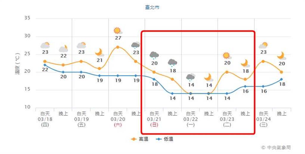 2021年03月19日本週日(21日)大陸冷氣團南下,北部及東北部天氣明顯轉冷。據氣象局最新氣象預報顯示,這次的冷空氣強度可能從東北季風升級成冷氣團,週日到下週二(23日)的低溫會降到14度。下週一(22日)氣溫最低,北部整天都是14度左右,一定要注意保暖。